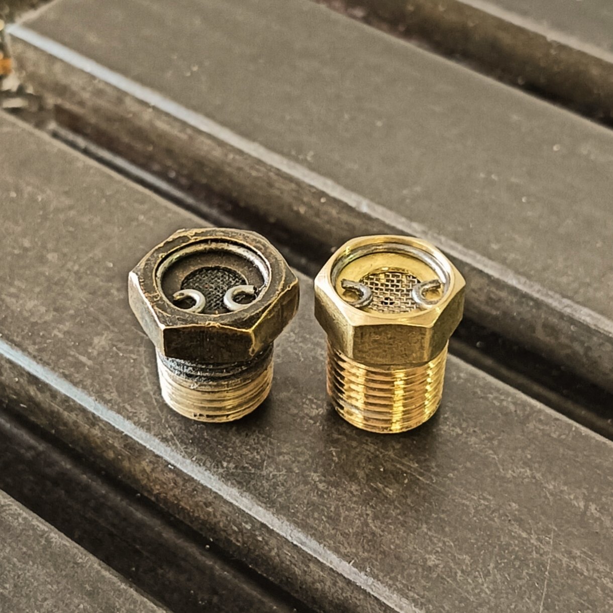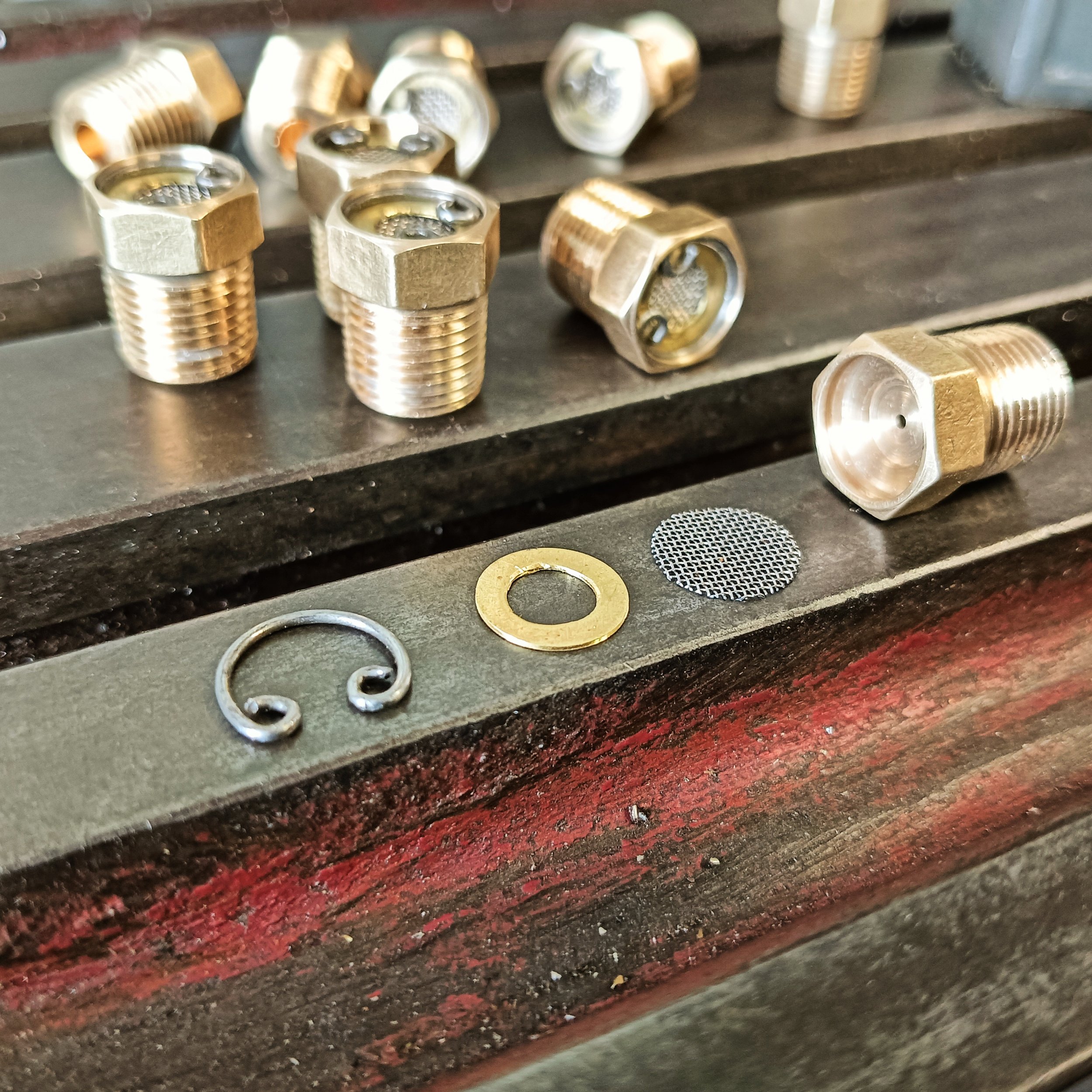 Brass body and retaining washer, stainless gauze, steel round wire clip. 1mm orifice